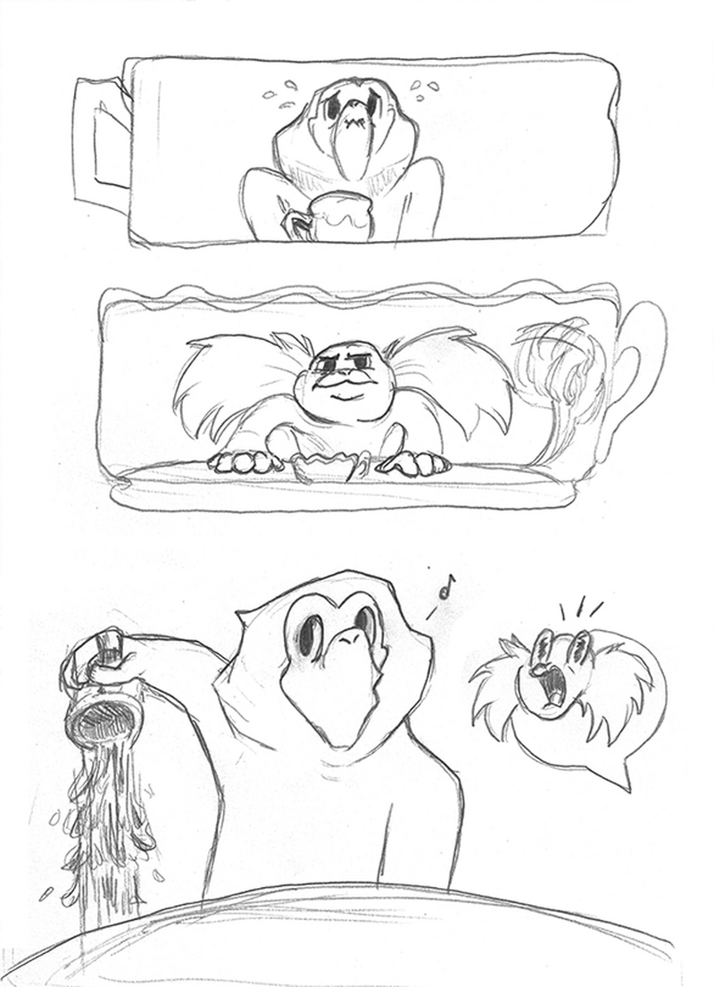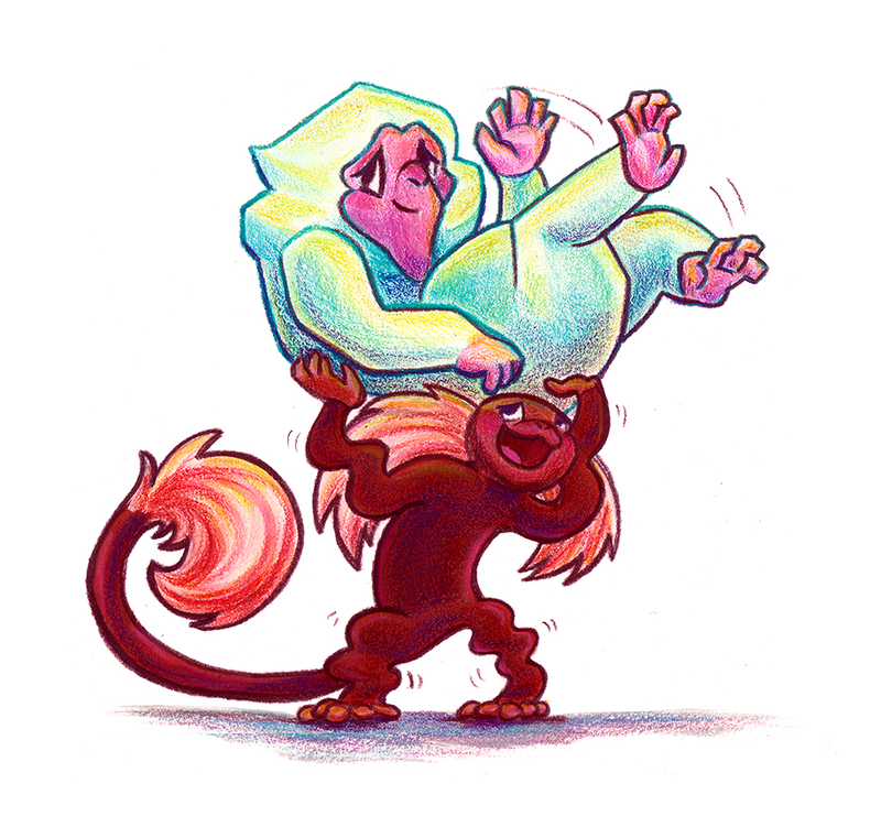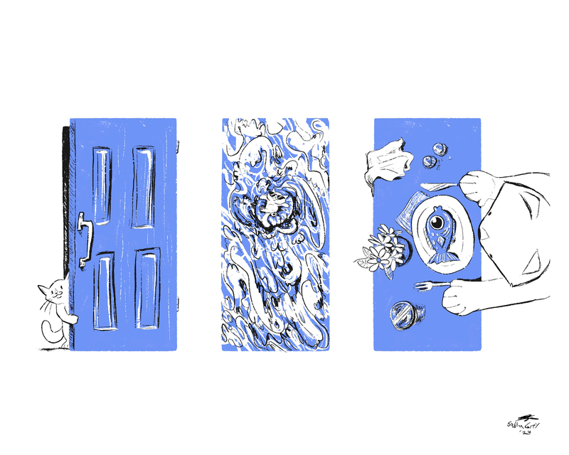 I primarily work with colored pencil, marker, and gouache on Bristol paper, with touch-ups done in Photoshop after scanning. Occasionally, I draw with Procreate on the iPad.